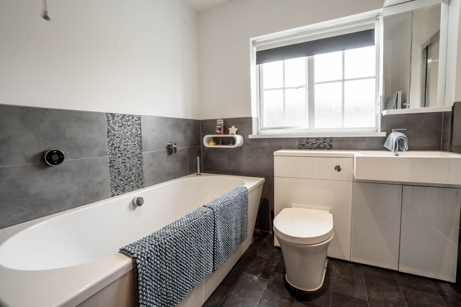 Upstairs, the first-floor landing leads to four well-proportioned bedrooms and the stylish family bathroom. The bathroom features a modern white suite with panelled bath, vanity basin, and a separate mains-fed shower in a glass cubicle. The master bedroom is generously sized and benefits from a contemporary en suite shower room with vanity sink, WC, and mains-fed shower. Cleverly, the en suite also links directly into bedroom two, offering a flexible layout ideal for young families. Bedrooms three and four both offer spacious and versatile accommodation, perfect for children, guests, or home offices.