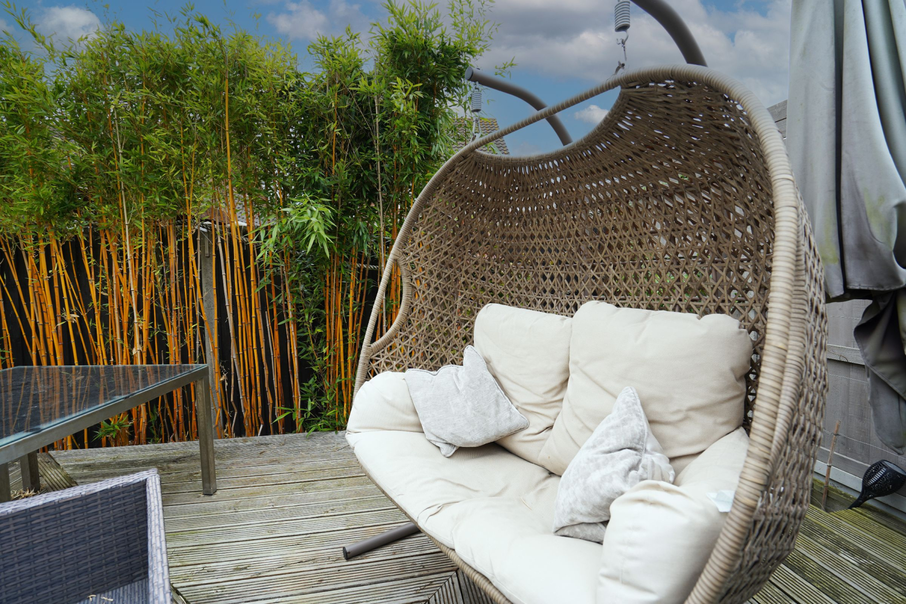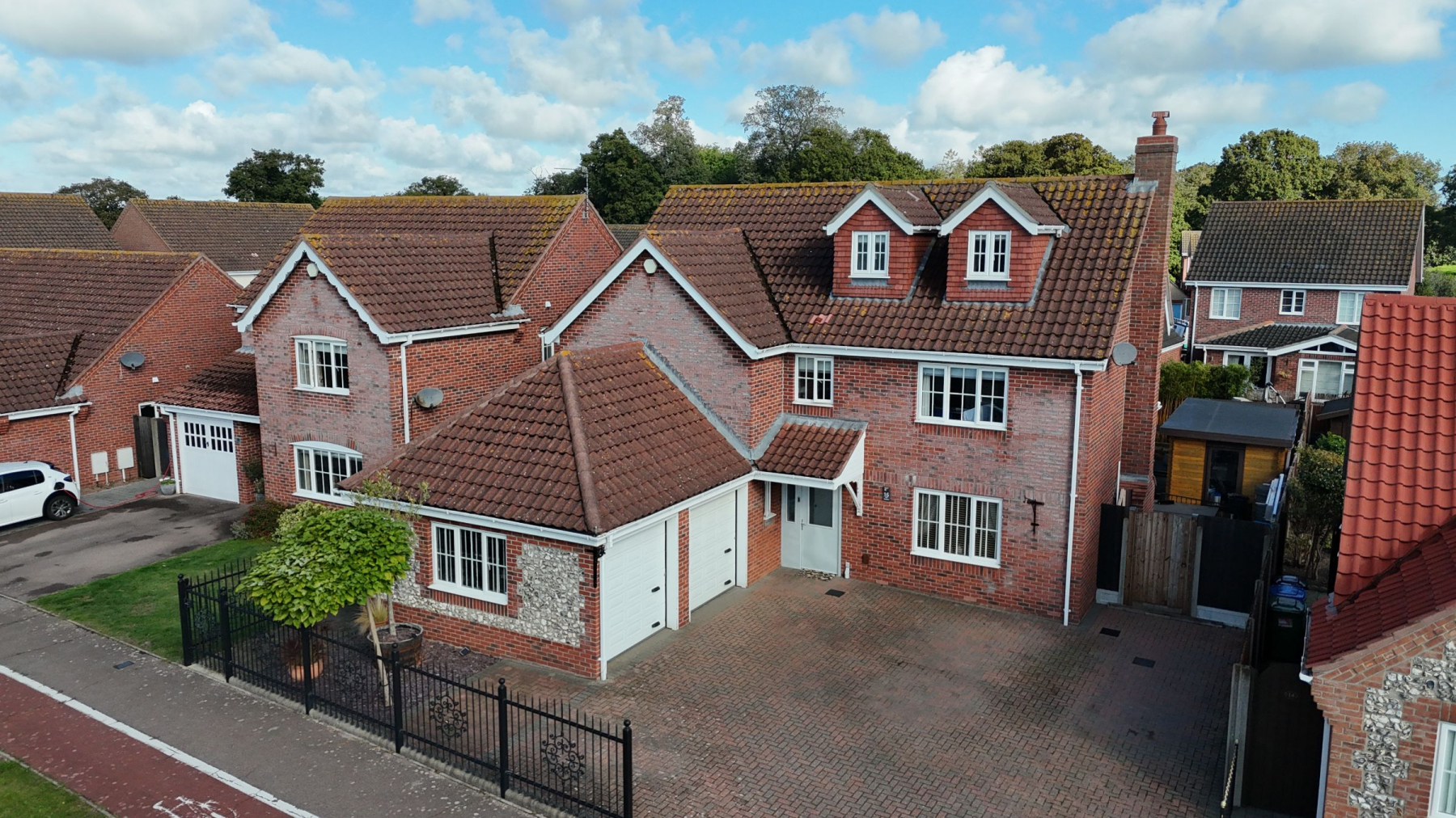 Externally, the home sits behind elegant cast-iron railings with a paved driveway offering parking for multiple vehicles, plus a double detached garage. To the rear, the landscaped garden is a true highlight - featuring a lawn with flower borders, a tranquil water feature, a raised decking area ideal for outdoor dining, and a versatile wooden cabin with power, offering endless potential as a studio, home office, or hobby room.