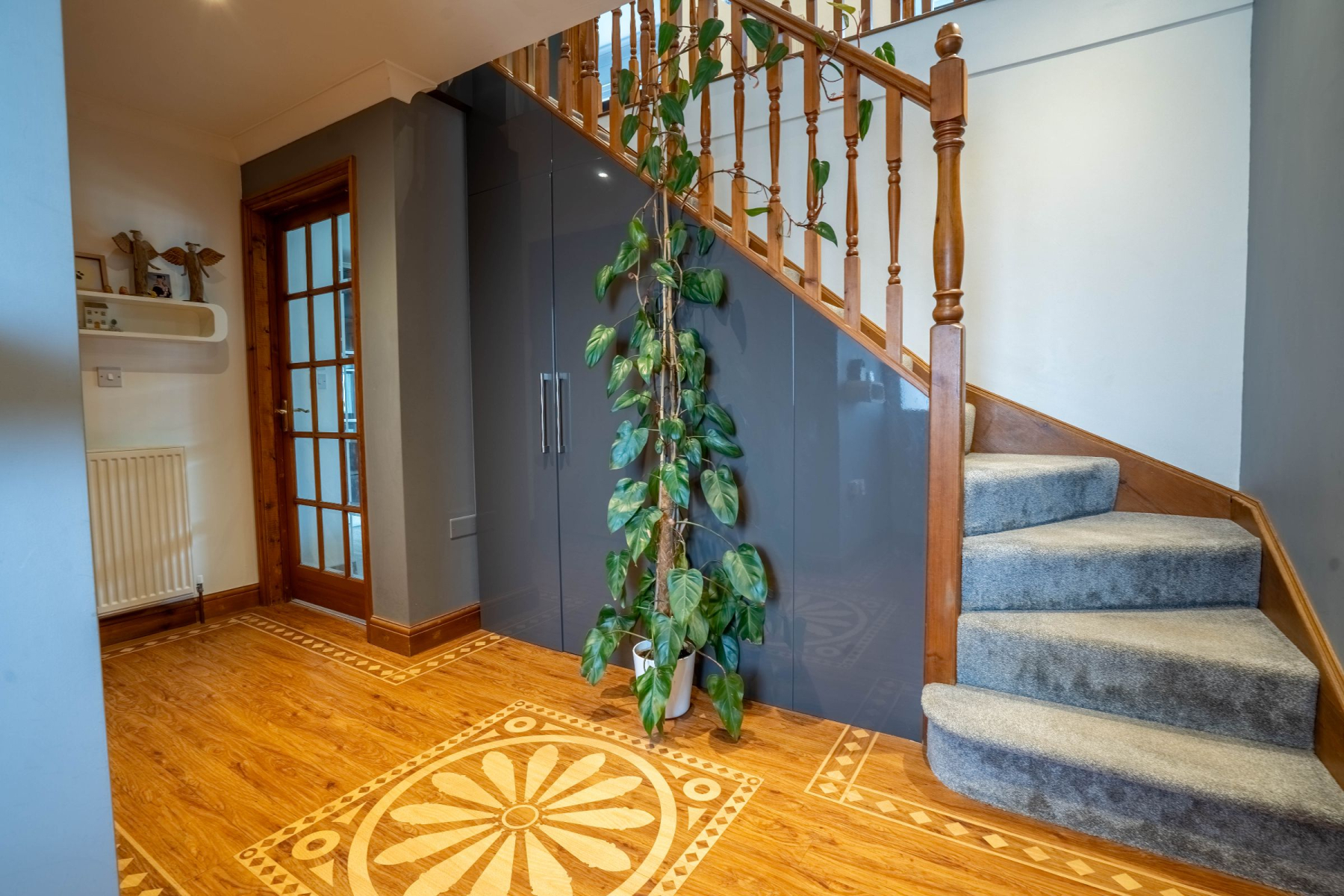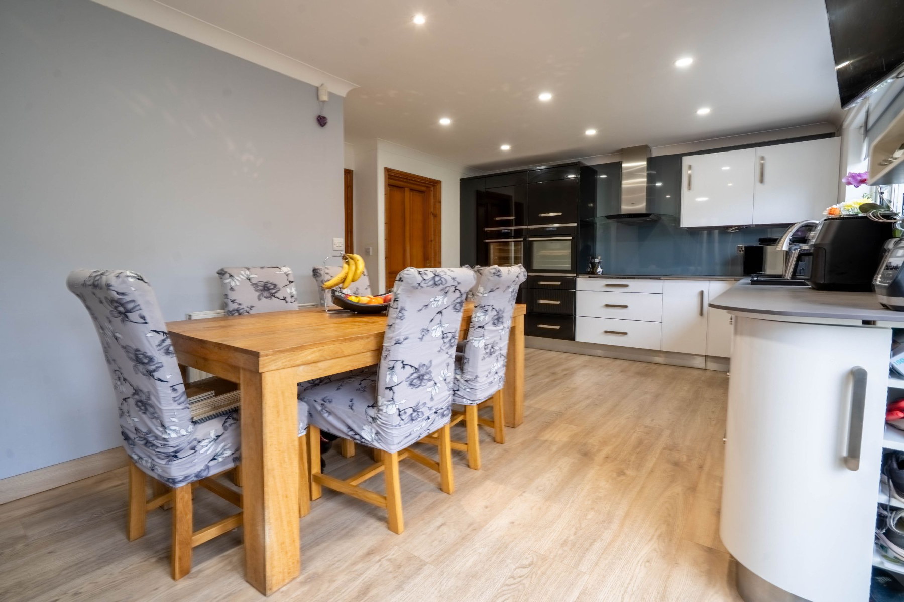 The kitchen/diner is a sleek and contemporary space, finished with quality J-pull units, integrated double oven, induction hob, extractor fan, and integrated dishwasher. A separate utility room provides additional storage and workspace, with side access plus space for a washing machine and tumble dryer.