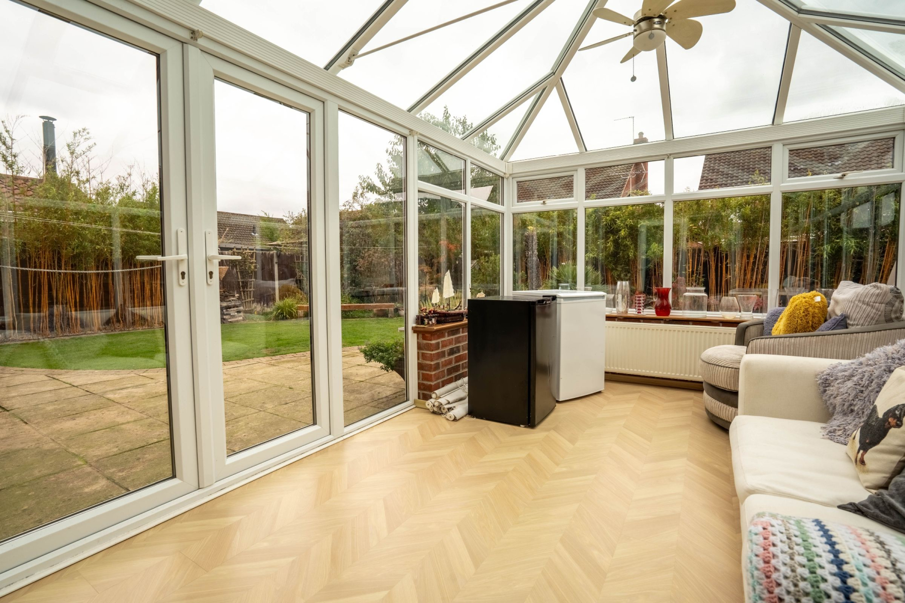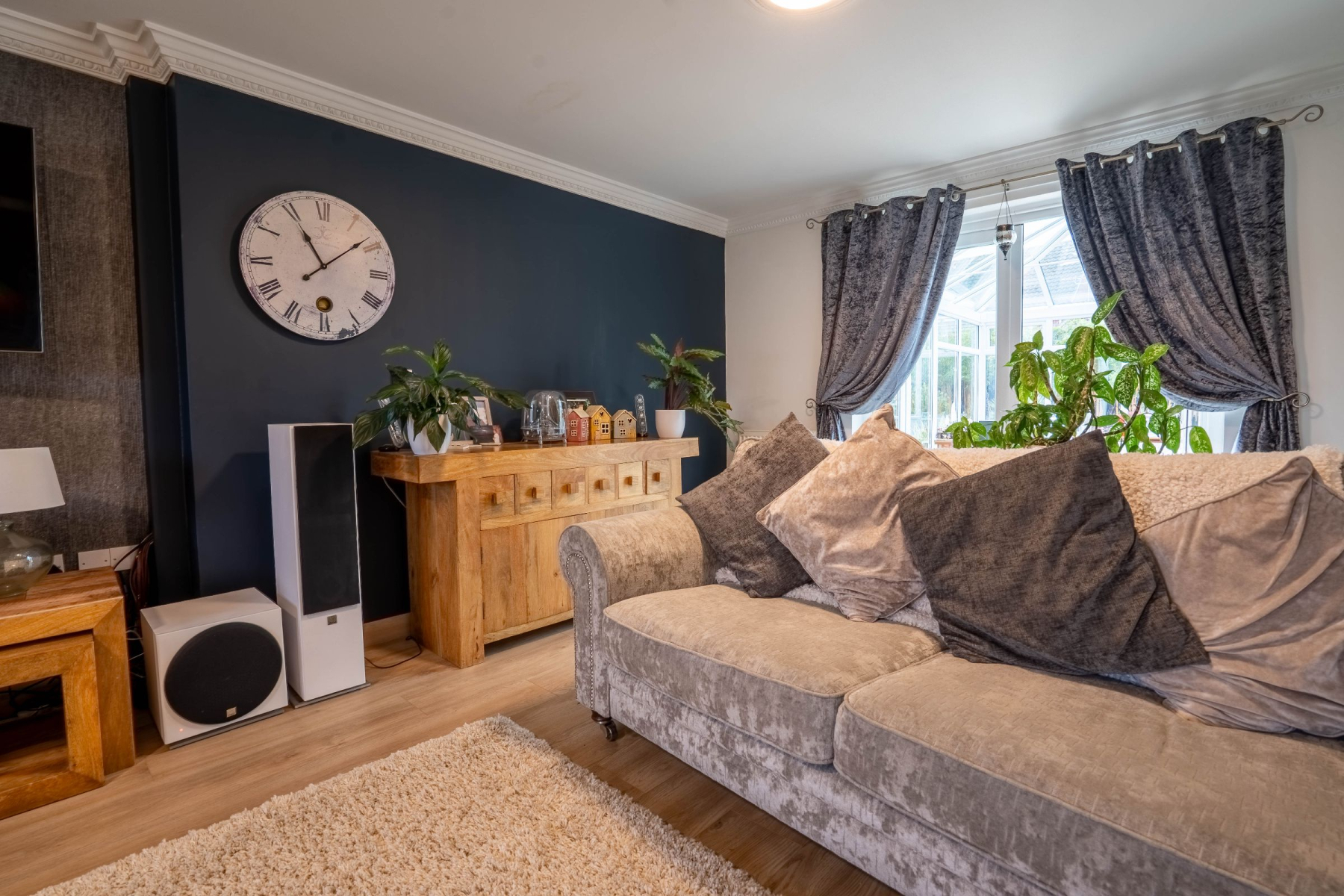 The lounge is a beautifully designed space, centred around a feature fireplace, with French doors flowing seamlessly into a stunning modern sunroom/orangery. This bright and stylish extension creates the perfect spot for year-round relaxation, bathed in natural light.