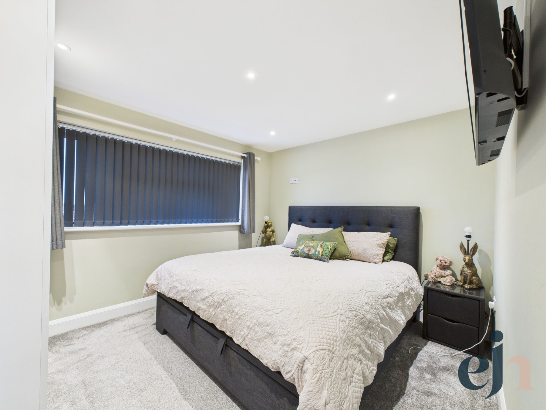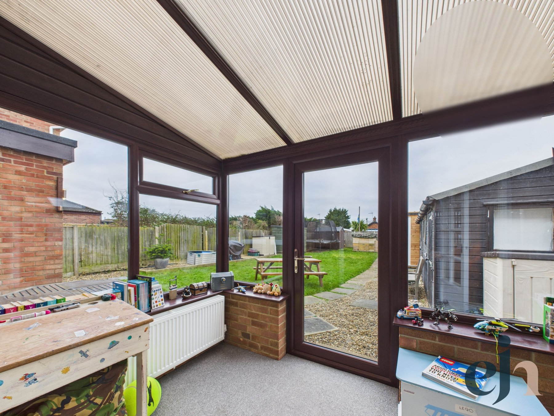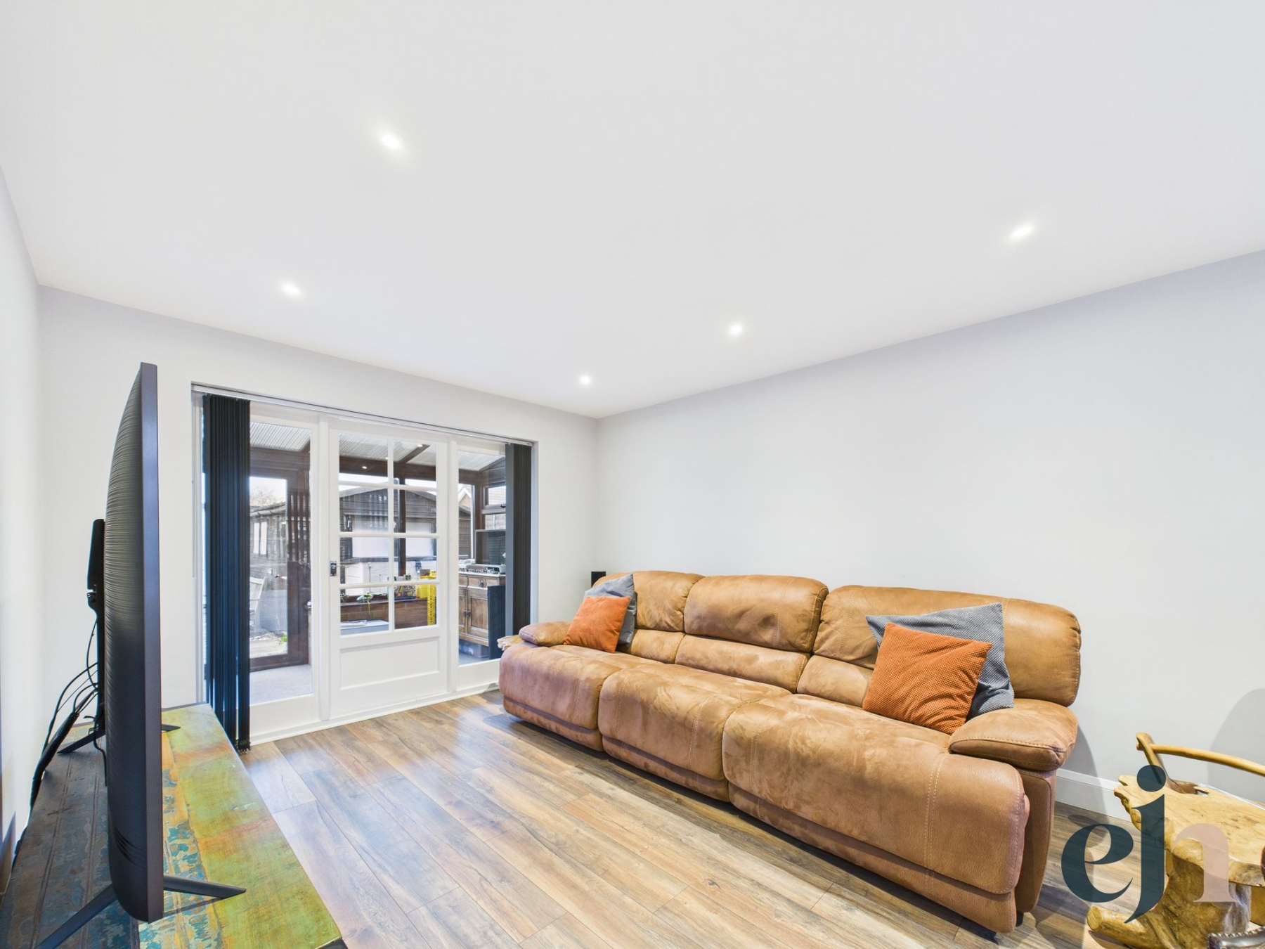 The lounge is an impressive and inviting space, featuring front-facing windows and UPVC French doors that open seamlessly into a contemporary sun room.