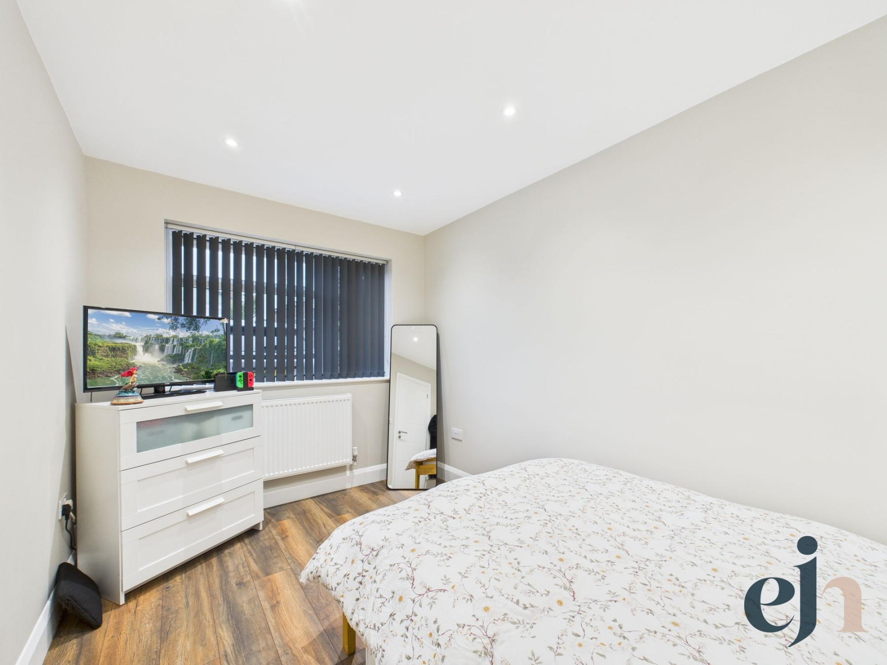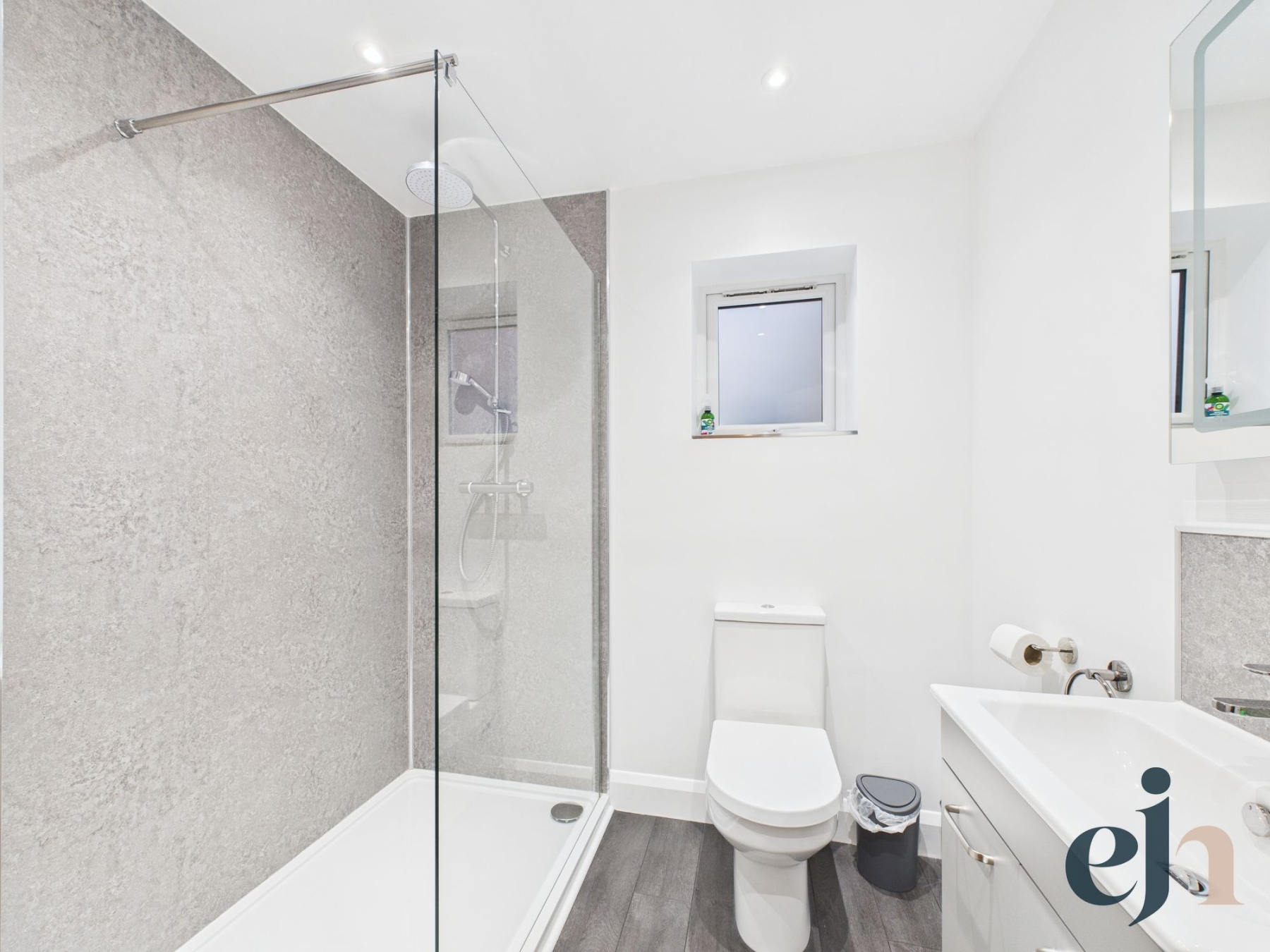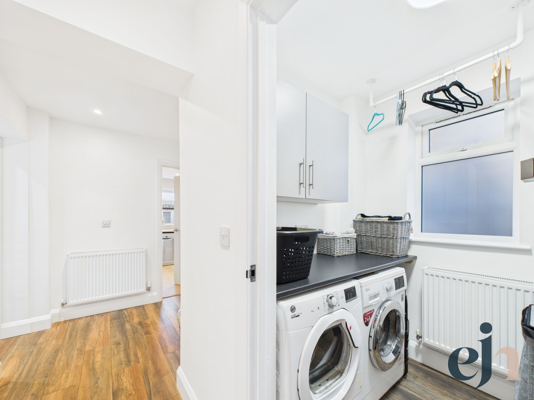 Bedroom four is a well-presented double room, finished with sleek laminate wood flooring and enjoying pleasant front-facing views. The utility room is both practical and refined, featuring laminate flooring, a worktop and dedicated space for a washing machine and tumble dryer. The modern shower room is finished to a high standard, comprising a white suite with vanity sink, WC, LED smart mirror and a luxurious mains-fed monsoon shower.
