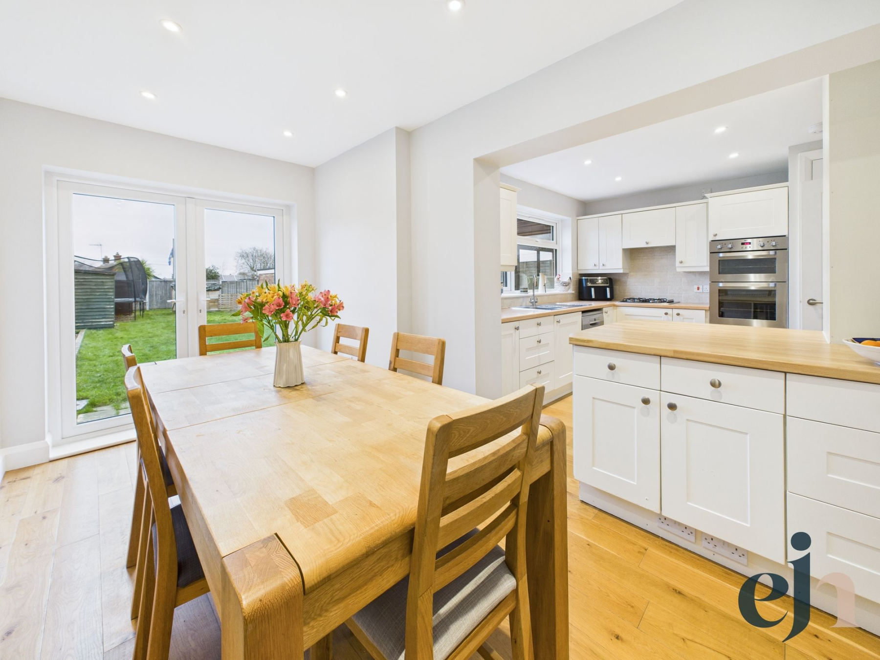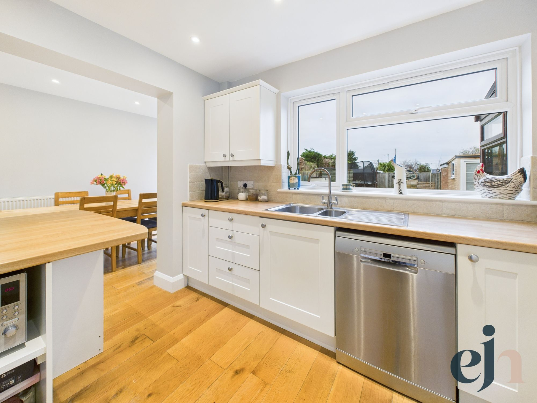 The kitchen is a true heart of the home, fitted in a timeless shaker style with integrated oven, grill and four-ring gas hob. There is ample space for a dishwasher, while a breakfast bar creates a natural divide between the kitchen and the stunning dining area, which enjoys views across the rear garden.