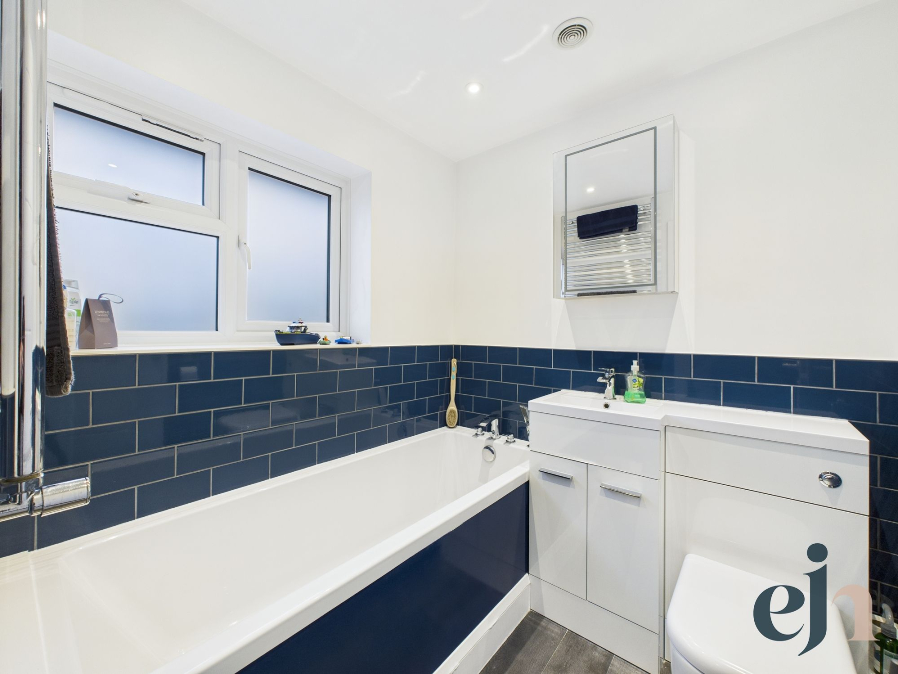 To the first floor, the landing leads to three well-proportioned bedrooms and a modern family bathroom. The bathroom is finished with a panelled bath, WC, vanity sink and striking designer tiling. The principal bedroom is a generous double, enhanced by fitted wardrobes, while bedroom two offers another comfortable double. Bedroom three is also spacious, making this an ideal layout for families.