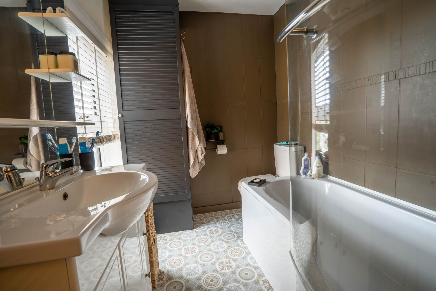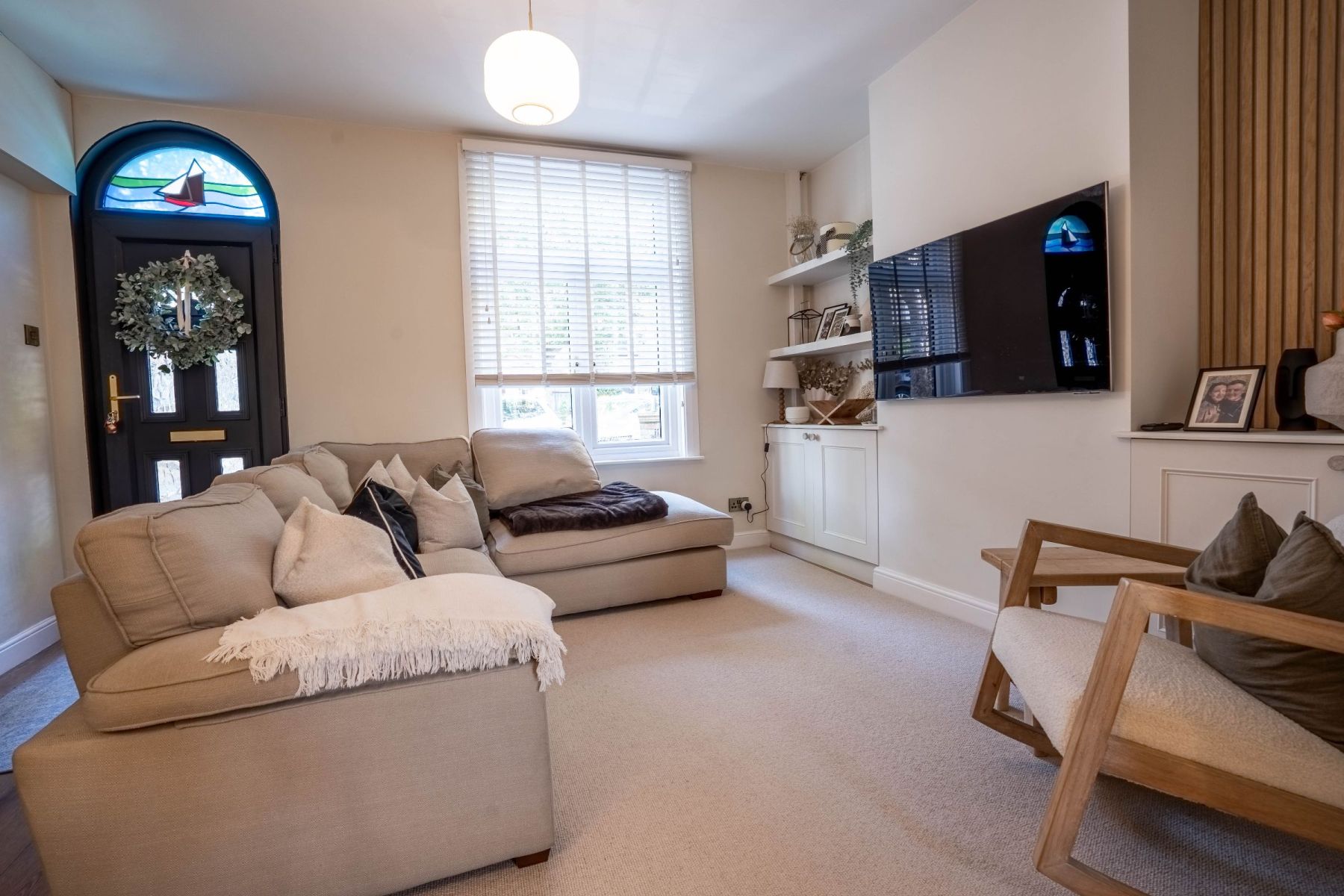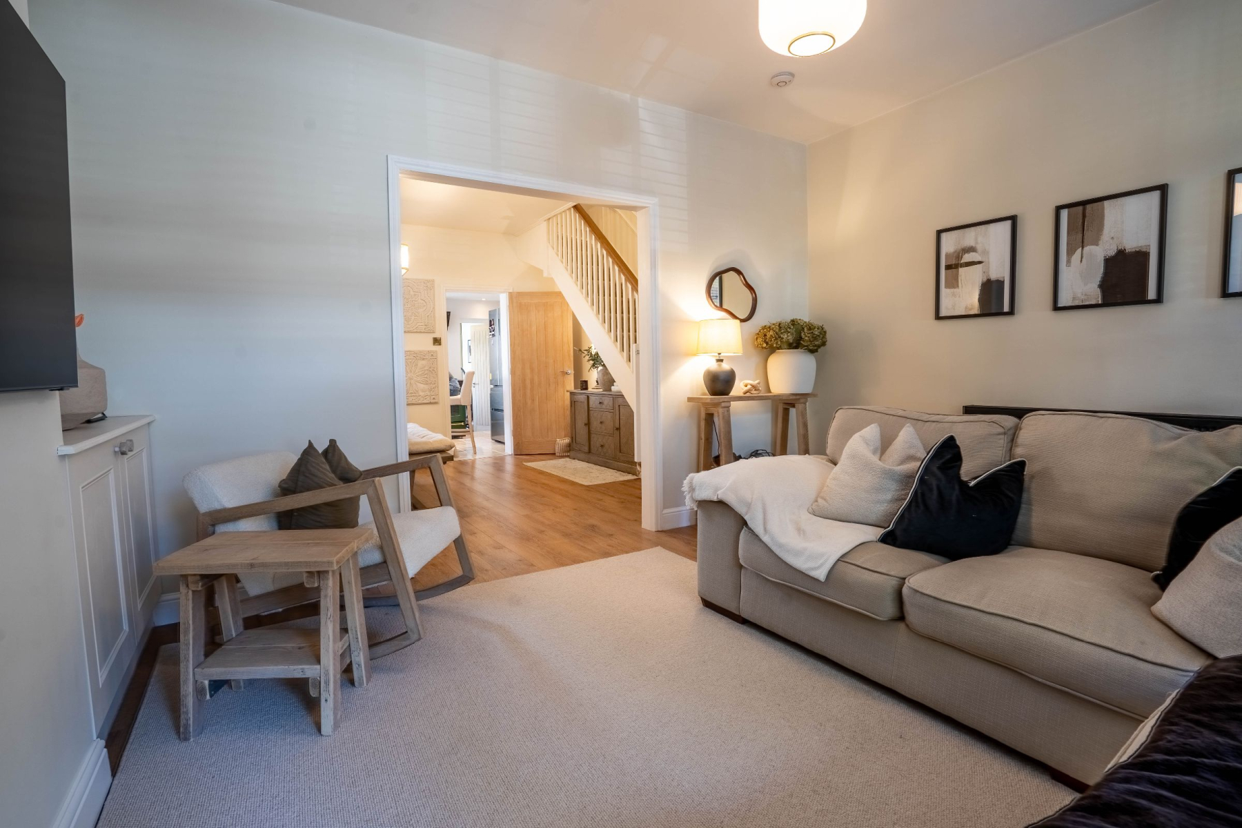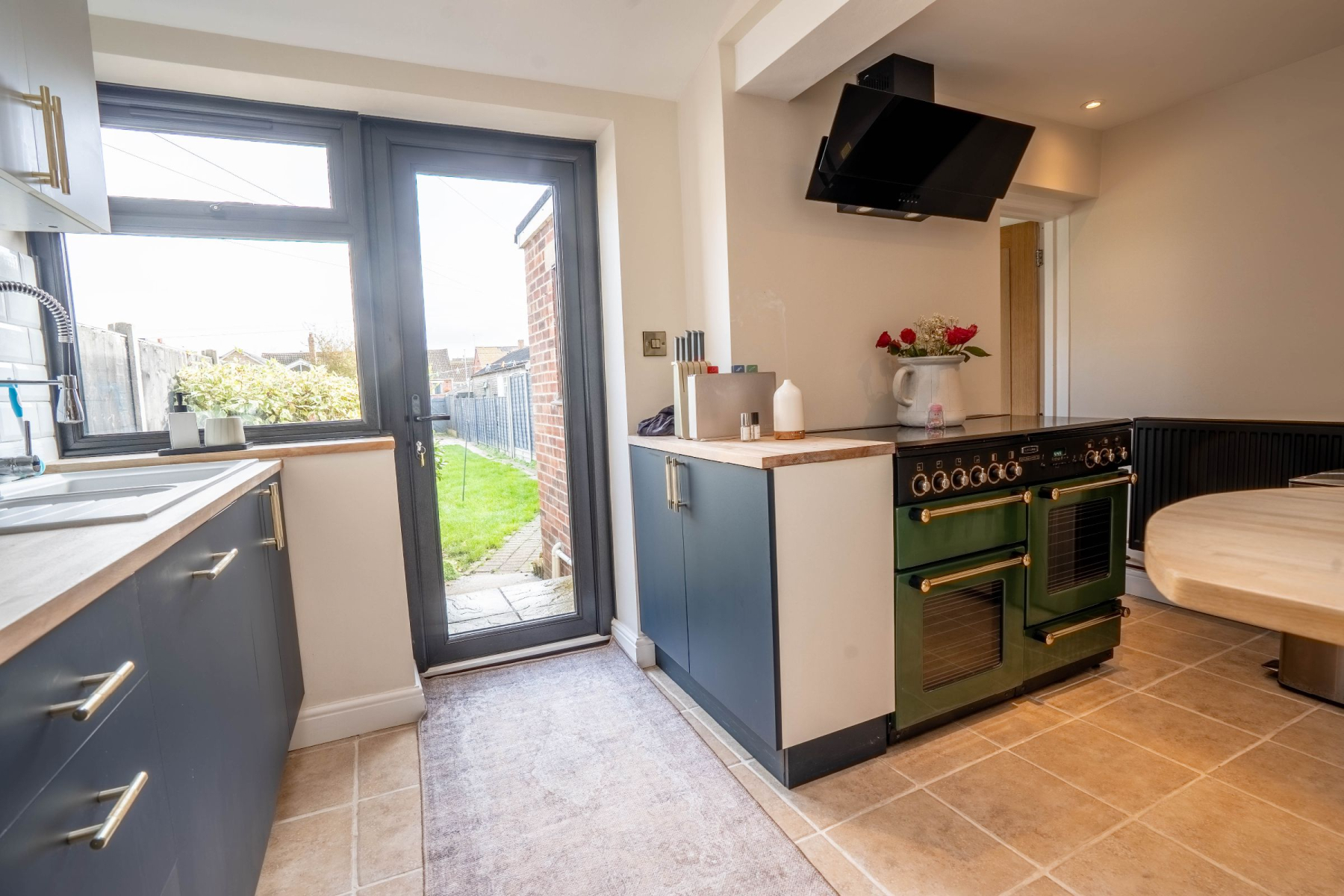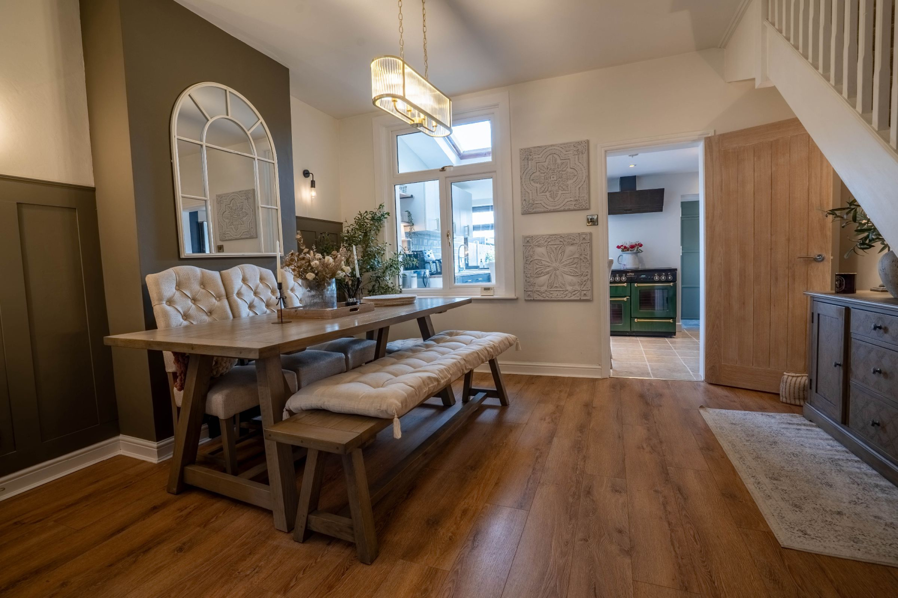The dining area features a striking open-plan layout with a charming stairwell leading to the first floor and a wide opening that draws your eye through to the kitchen extension. Bathed in light from a Velux window, the kitchen combines practicality with style. Shaker-style cabinetry provides ample storage while integrated appliances, including a dishwasher and range cooker, create a seamless, high-spec finish. A rear door opens directly onto the garden, making indoor-outdoor living a breeze.