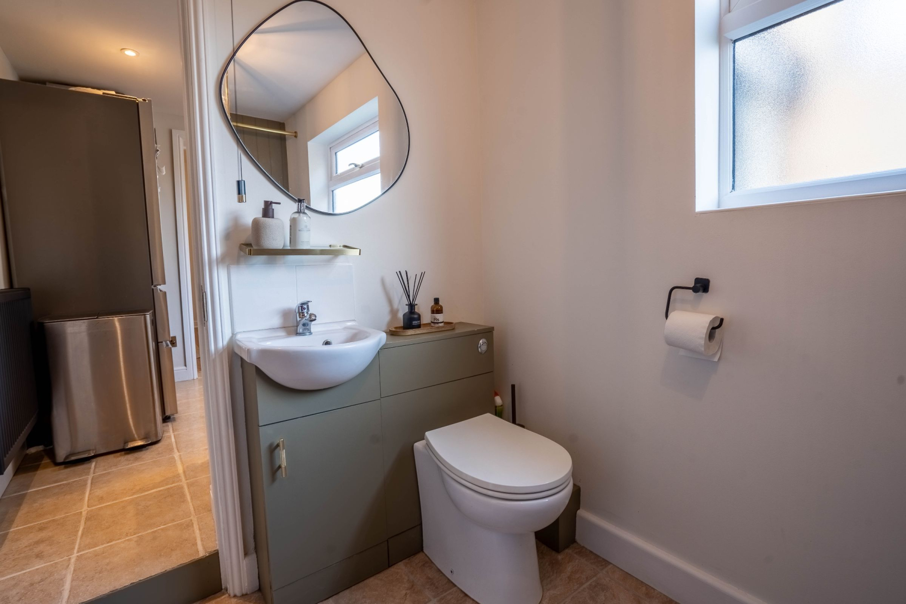 Tucked away beyond the kitchen, the utility/WC continues the Shaker theme with tall storage units, designated spaces for a washing machine and tumble dryer, and a modern toilet and pedestal wash basin, perfectly blending convenience with design.