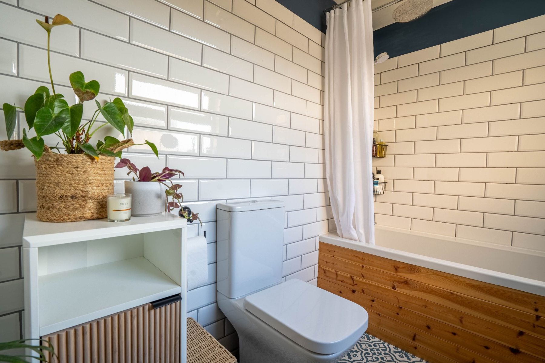 Beyond the kitchen, an inner hallway provides access to a handy storage cupboard housing the gas combi boiler and leads to the contemporary bathroom. Here, modern luxury meets classic design, featuring decorative tiled flooring, a sleek panelled bath, a mains-fed monsoon shower for that spa-like experience, and a heated towel rail to keep things extra cosy.