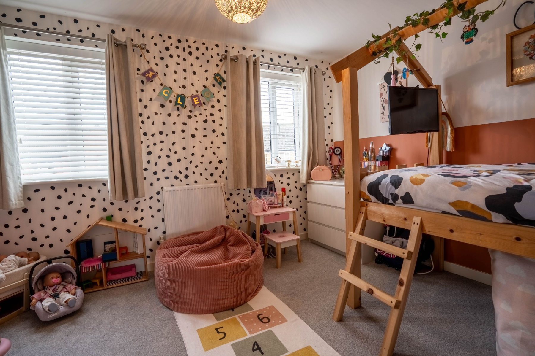 On the first floor, the landing leads to two spacious double bedrooms, both beautifully proportioned, and a modern family bathroom finished with a pristine white suite comprising panelled bath, pedestal wash basin, and WC.